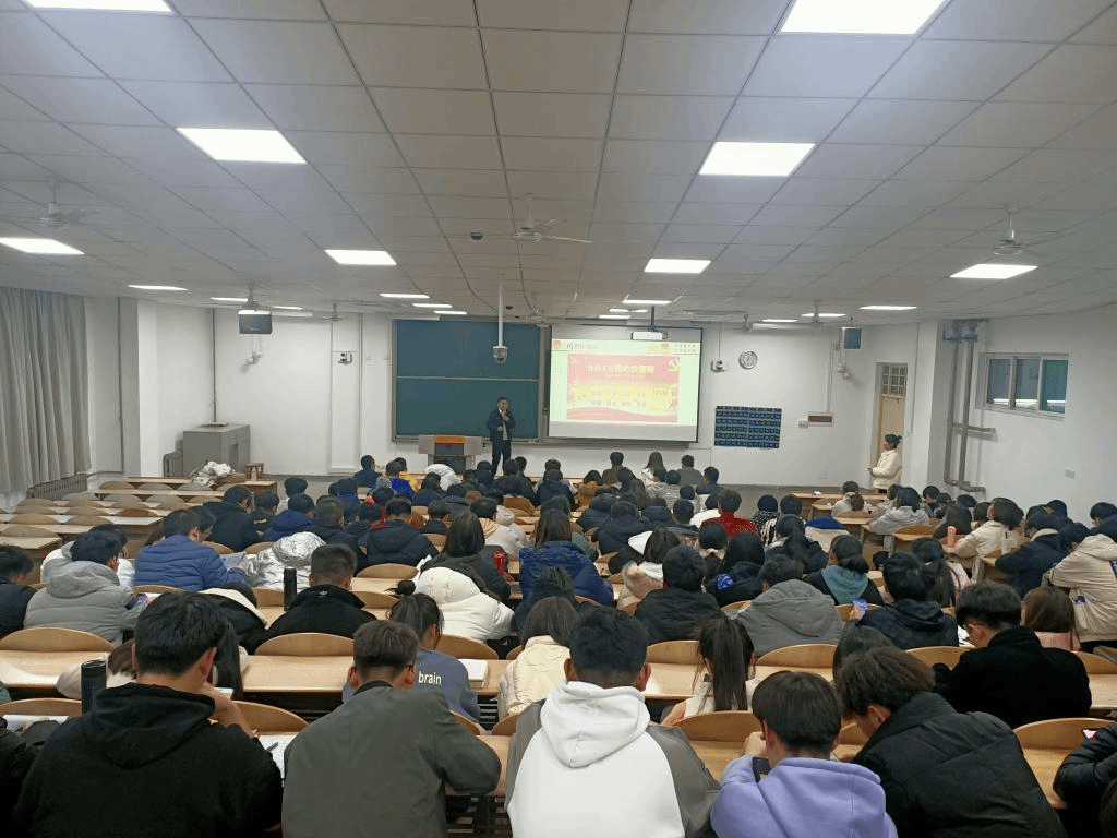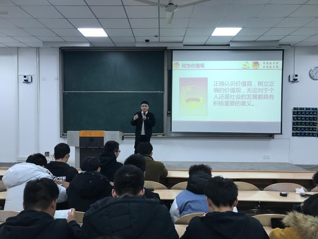 原团委副书记白洋讲授。首先,他围绕“忆初心”主题,向同学们再次重申了“初心”二字的含义。希望大家能够牢记中国共产党的初心和使命,不断强化理想信念。并对新时代青年的时代使命做出强调,号召青年团员勇于有梦、敢于追梦、勤于圆梦,让理想信念在创业奋斗中升华,让青春在创新创造中闪光。之后,他重点讲述了树立正确的世界观、人生观、价值观对于青年人生发展的重要意义,并着重强调诚信这一中华民族的传统美德。通过列举身边典型事例来告诫大家诚信之重,并用和诚信有关的典故向大家传递“学道存乎信,立信存乎诚”的深刻内涵。