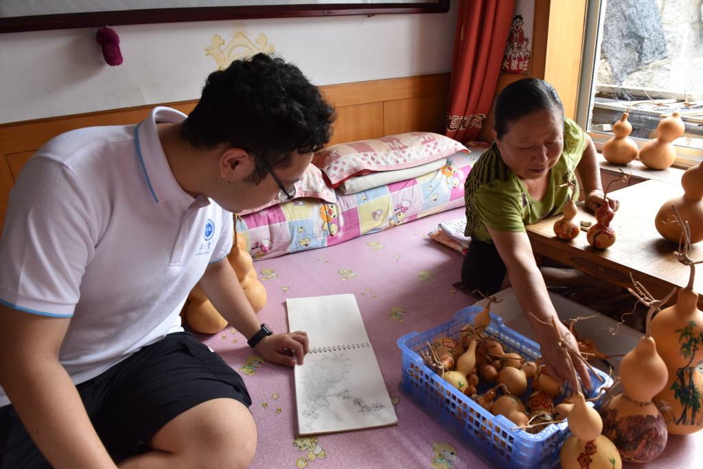 对于楚岘村采摘、住宿、餐饮、旅游这都是一些较大的产业,但是村中一些年龄较大的老人怎么办呢?实践队东部分队队员走访过程中发现村中奇招频出,大产业带动小产业,实现共同富裕。通过村中人介绍,队员们有幸拜访了村中的“葫芦奶奶”,“在我65岁时,报名参加了村里组织的绘画学习班,通过12天的学习,我掌握了在大小葫芦及石头上绘画的技巧,一年的经营不仅让自己老有所乐,年收入更是增加万余元。”奶奶骄傲地和队员们说,“经常有外地的朋友不远百里前来购买,以后希望能够继续把葫芦绘画做大做强,带领村里其他人一起致富。”在调研采访过程中,实践队员深切感受到了乡村振兴战略带给人们的巨大变化,农民的获得感、幸福感、安全感不断提高。