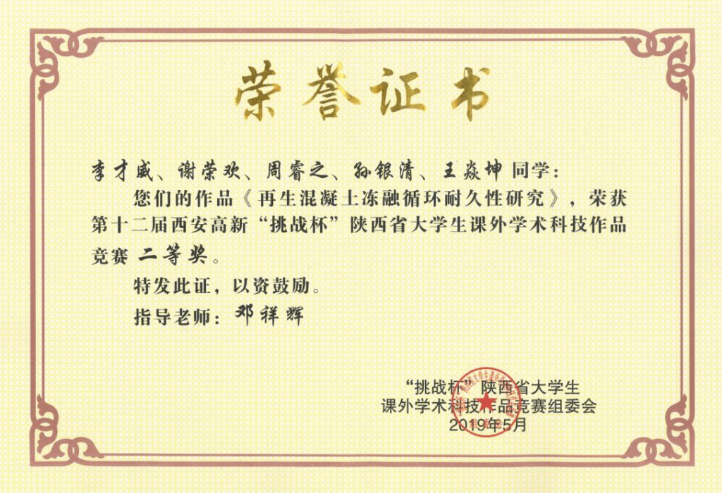 教师邓祥辉指导、李才威等本科生完成的作品《再生混凝土冻融循环耐久性研究》获得省级二等奖。