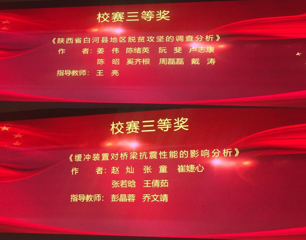 教师王亮指导的作品《陕西省白河县地区脱贫攻坚的调查分析》,彭晶蓉及乔文靖共同指导的作品《缓冲装置对桥梁抗震性能的影响分析》均获得校级三等奖。省赛阶段,由足球比分网
