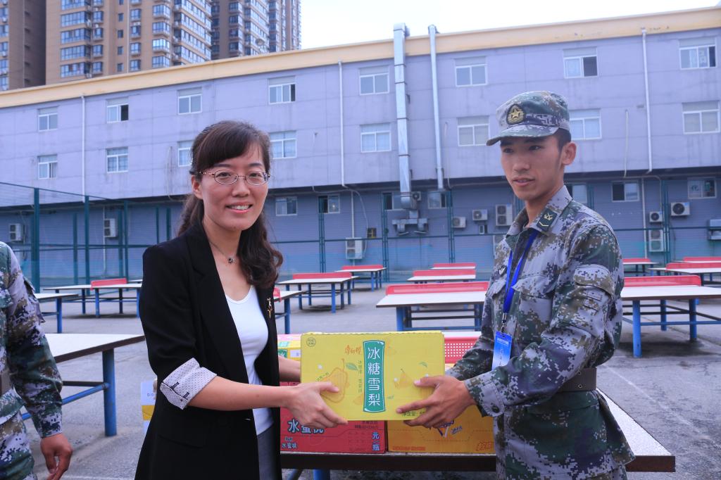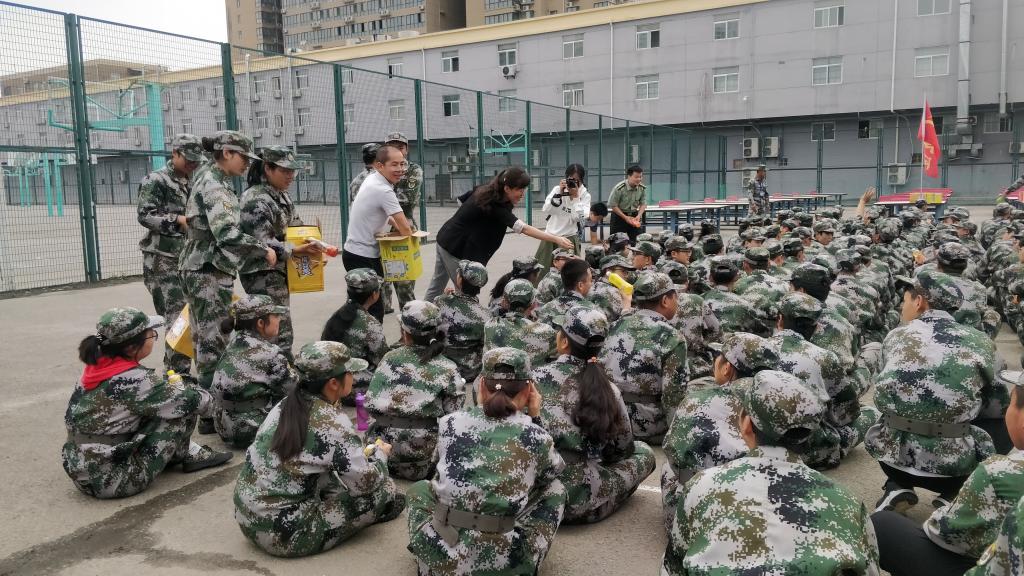 学生工作团队来到篮球场内,慰问正在军训的足球比分网