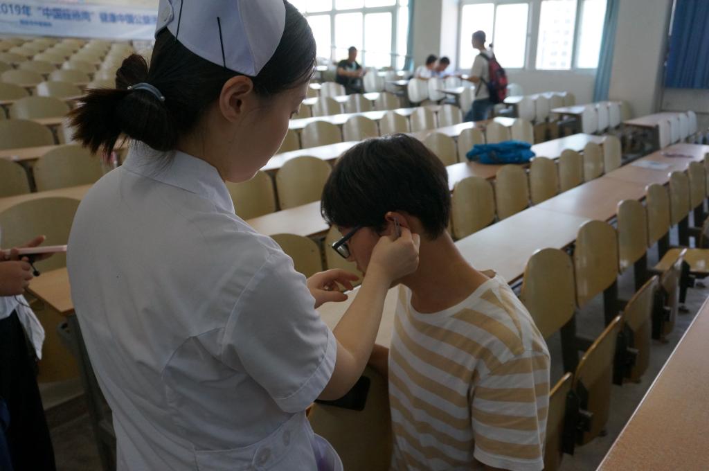 吴卿医生从“痤疮的表现、病因病机”入手,讲解痤疮的预防、饮食及肌肤护理注意事项、中西医治疗等方面作了详尽阐述。讲座后,进行了现场解答环节,每位医疗人员耐心细致解答,为同学们提供优质的义务诊疗服务,给出合理建议。此外,医生们充分发挥中医特色,在现场为部分学生进行了耳穴贴压治疗义诊活动,得到学生们的一致赞誉。