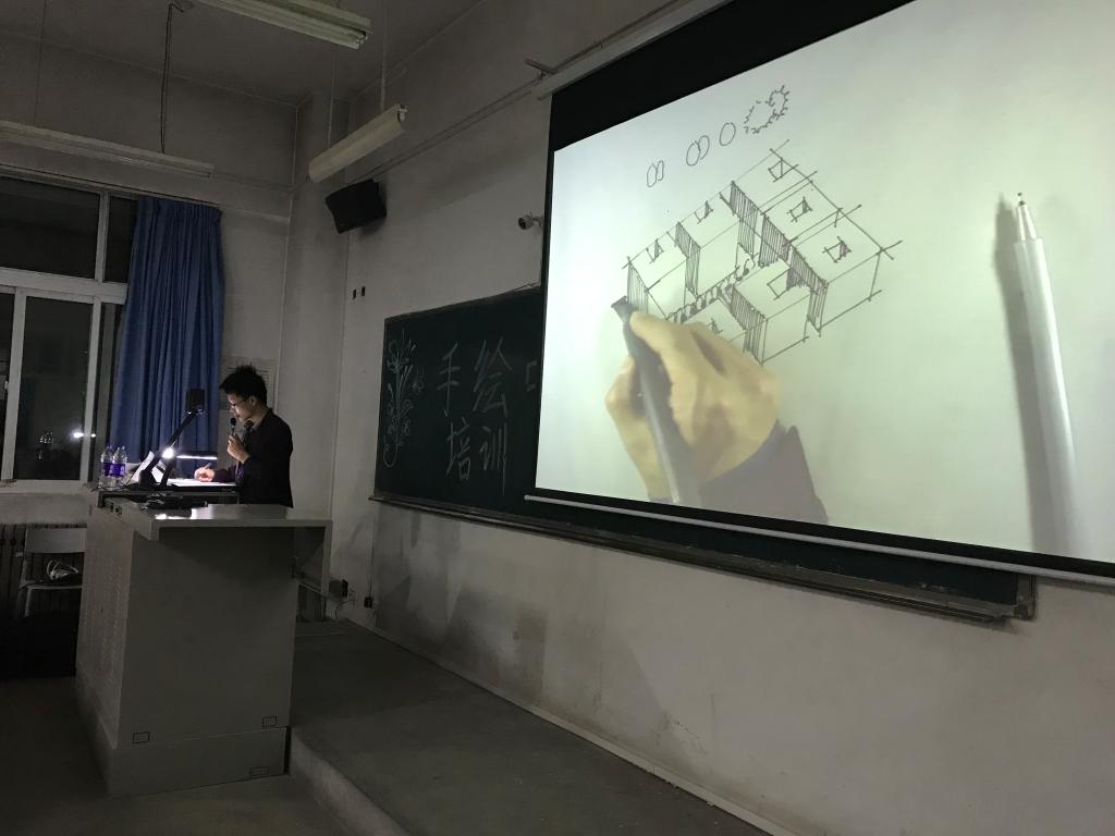 本次培训由郭庆老师主讲,他向我们展示了手绘的意义与美感。让同学们学会了手绘的基本构成线条和构图方法。同学们在课堂上认真听讲,紧跟着手绘老师的步伐也绘画起了自己的作品。手绘是应用于各个行业手工绘制图案的技术手法,其内容很广阔,可以直观形象的展现建筑物的美感。此次课程的目的就是为了让我们了解手绘并亲手感受,学会手绘的基本技巧,并将自己的创意和灵感记录和描绘出来。随后老师分享了自己的经验,同学们也纷纷提出了问题,老师也进行了答疑。