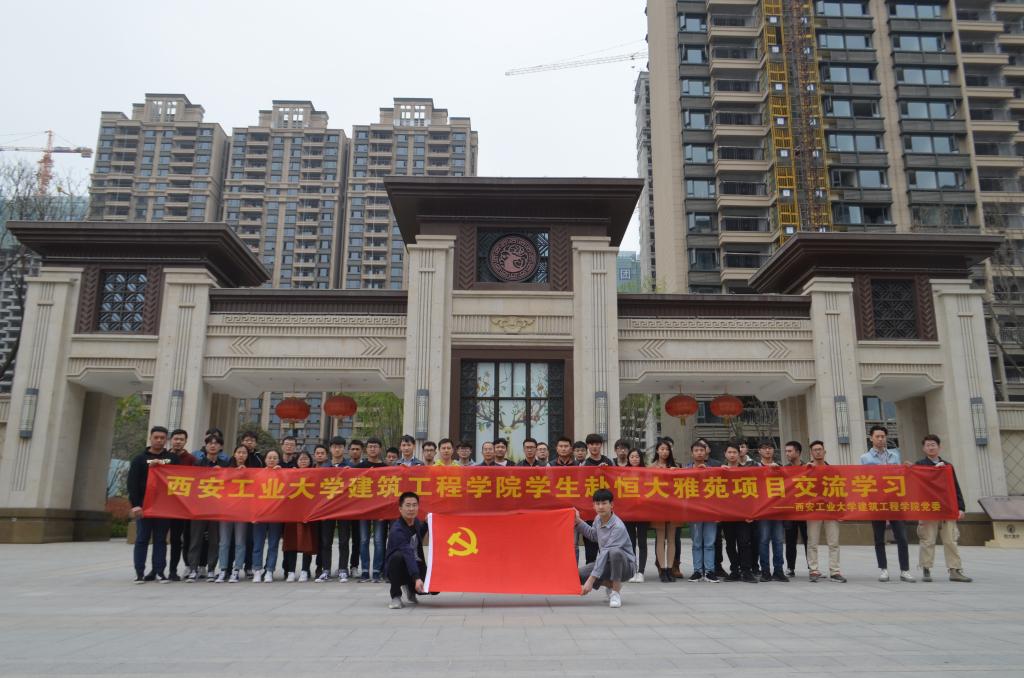 行程伊始,在老师和恒大工作人员的带领下,一行人来到了恒大雅苑。该项目在工作人员讲解下,了解到项目分为两大部分,高层住宅区和别墅区,学生党员通过沙盘了解了项目规划;后参观工地,从而使同学们了解到本行业的一线员工的工作情况和未来发展方向。而后,一行人前往“恒大童世界”,该项目地属秦汉新城和西咸新区交汇处,渭河河畔,与国际机场、高铁站为邻,地理位置优越,适合人居住,是未来打造西安为国际化大都市的重要组成部分。参观学习完毕全体合影留念。