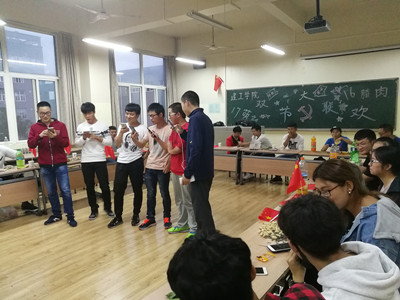 联欢会开始后,辅导员们对到场的留校同学表达了亲切的问候,随即大家开始了一场有趣而温暖的联欢会。“请全体起立,奏唱国歌!”全场庄严肃穆,每一个人都在用歌声表达对祖国68岁生日的祝福。随后进入游戏和节目表演环节。首先进行的是“名字接龙”破冰游戏:有的同学搞笑不已,有的同学展现出超强的记忆力,随着游戏难度的逐级增加,老师们也加入到游戏中。大家很快认识了彼此,全场气氛轻松活跃,笑声频频。之后来到了才艺展示环节:同学们都跃跃欲试,在小小的舞台上展现不一样的自己,歌曲、舞蹈、笑话应有尽有;值得一提的是老师们也亲自上阵,为同学们带来了欢快的舞蹈和动听的歌声,也让大家见识了老师们可爱有趣的一面。欢声笑语后,为迎接“辩处逢生”辩论赛的到来,老师们组织全场人员开展了一场题为“大学里恋爱是否必修”的即兴辩论赛,双方辩手展开了激烈辩论,全场同学情绪高涨,各抒己见。最后整个联欢会以一场别开生面的集体华尔兹舞蹈学习结束:伴随着音符跳动,同学们挑选出自己的舞伴,生涩的舞步、滑稽的手势、欢快的笑声洋溢在整个教室之中。