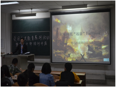 活动开始由团委书记韩霄老师向全体学生干部分析了学生青年应该具备的爱国热情以及规范的爱国行为;之后韩老师作了以《大陆青年“远征”facebook——一场没有硝烟的爱国战争》为题的爱国主义教育讲座,幽默形象的介绍了在这个虚拟空间里,字符、表情包飞扬的背后,两岸青年学生对文化深度沟通的渴望。这是一场没有硝烟的战争,大陆青年大学生与台湾青年大学生之间的表情包大战,这是大陆网民青年通过一种温柔的方式进行着爱国活动;此次讲座各位学生干部反响强烈。