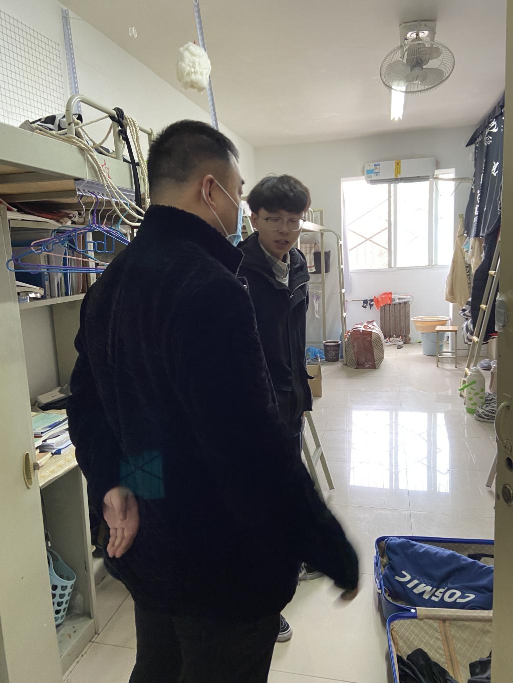翟超与返校学生进行深入交谈,详细询问大家的学习情况、假期生活与新学期学习计划。各年级辅导员认真摸排学生返校情况,针对学生学习情况、宿舍安全与疫情防控提出建议,要求确保宿舍通风、晾晒被褥、清理卫生死角,保持良好的生活习惯,做好宿舍消杀与个人防护。