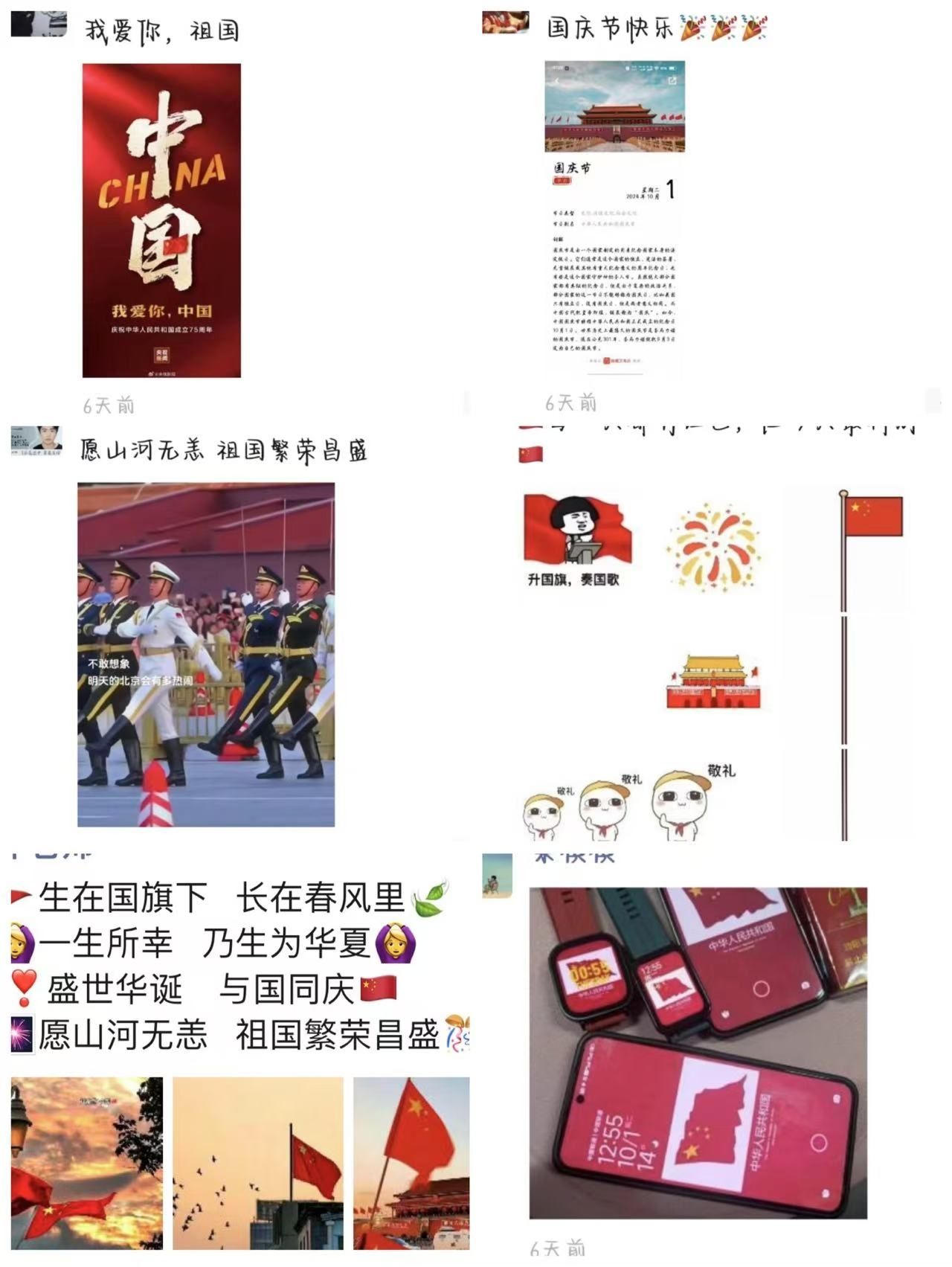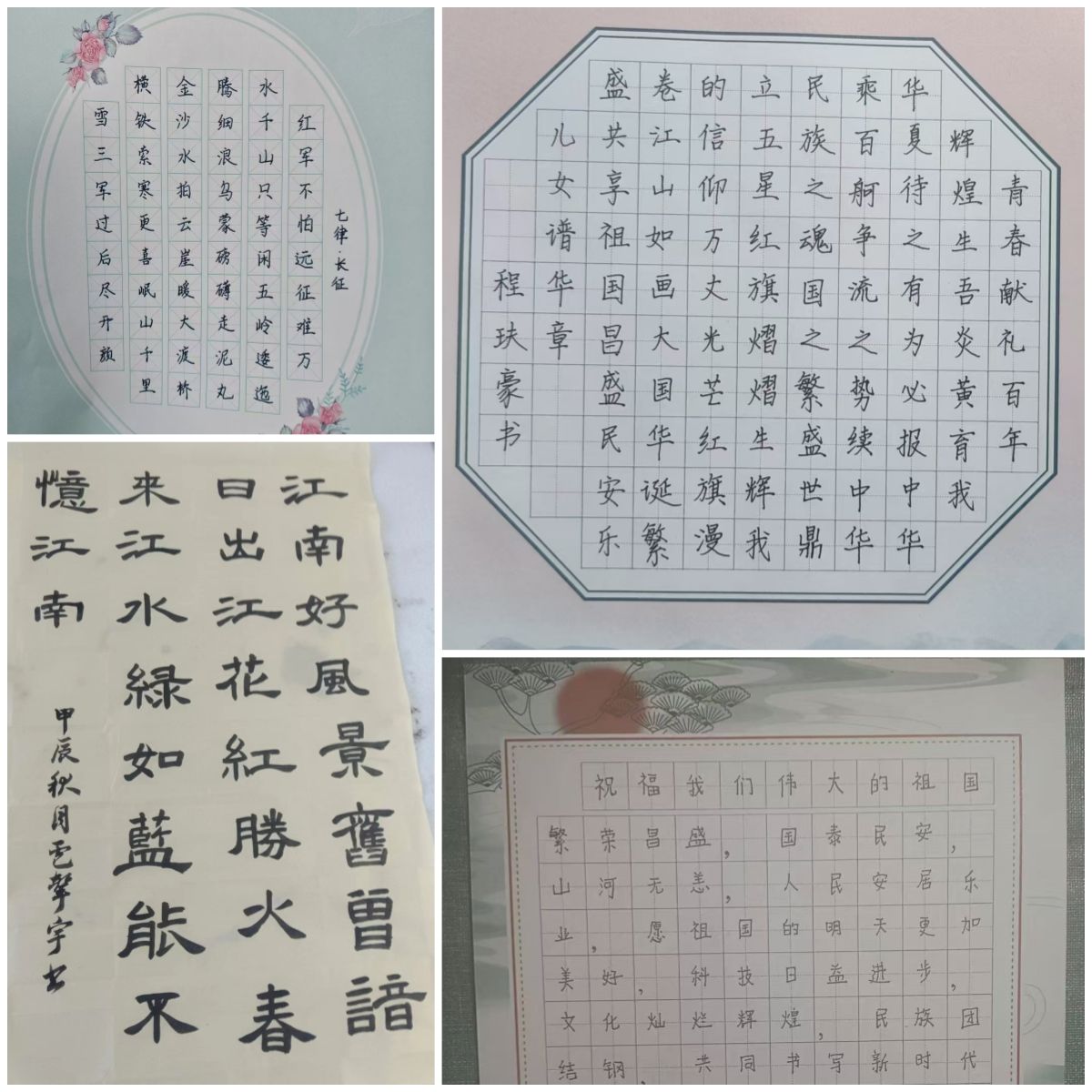国庆期间,学生们通过抖音、微博、微信朋友圈等网络平台发布自己对祖国母亲的祝福语,充满对祖国热爱和对未来憧憬,也传递出他们作为新时代青年的责任感和使命感。学生们通过一首脍炙人口的《歌唱祖国》激发强烈爱国情和民族自豪感,用真挚情感和饱满热情表达对祖国热爱和对美好生活向往。以“书写爱国情怀,传承文化精髓”为主题,征集学生书法作品。无论是硬笔的铿锵有力,还是软笔的温婉流畅,每一幅作品都如同一个个跳动的音符,共同谱写着对党、对国家、对革命先烈的深情赞歌。