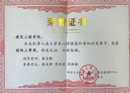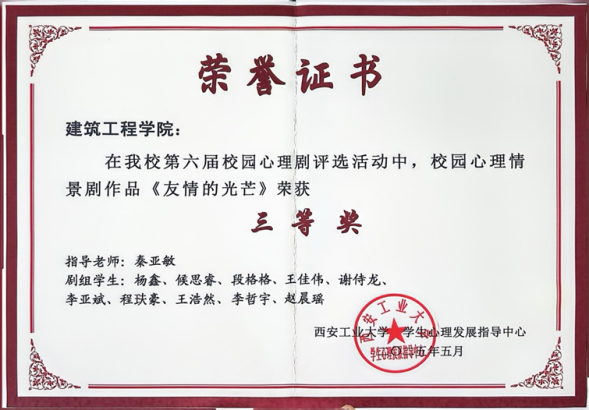 提交的学生心理健康教育成果典型案例《自己的人生还是要自己签到》(秦亚敏)荣获西安工业大学学生心理健康教育成果二等奖,学生心理健康教育成果典型经验《用爱守护 以爱育心浇灌希望》(秦亚敏)荣获西安工业大学学生心理健康教育成果三等奖。