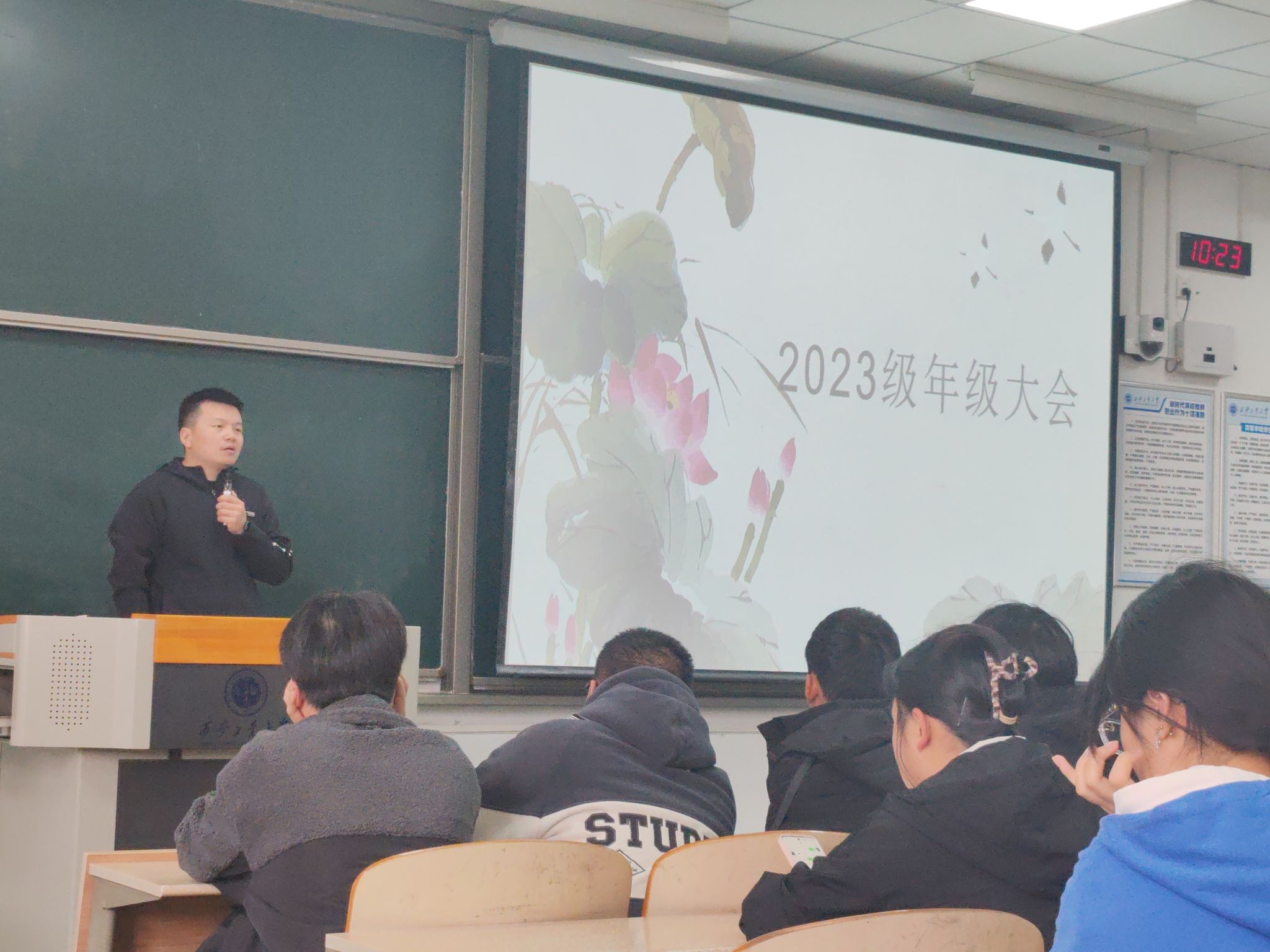 在教1-203教室召开了年级大会。本次大会由刘冬老师主持,2023级全体学生参加。旨在帮助同学们明确近期学习生活要求,强化思想引领,确保年级各项工作平稳有序开展。