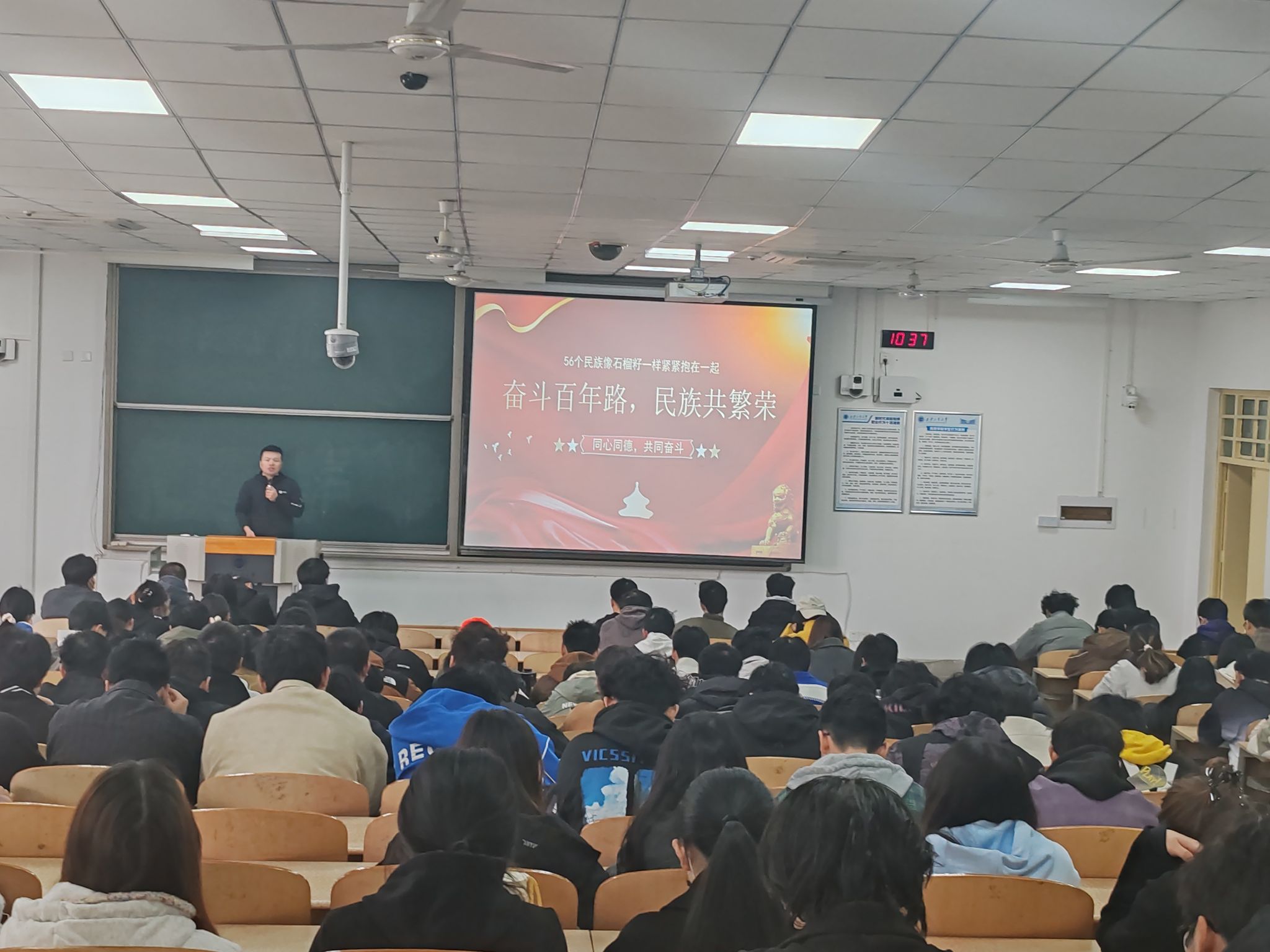 会议第二项,刘冬老师以“民族共繁荣”为主题进行了专题讲述。他从文化传承、民族团结等多个维度,阐释了56个民族像石榴籽一样紧紧抱在一起的丰富内涵与时代意义,引导同学们深刻认识到各民族是血脉相连的一家人,鼓励大家争做民族团结进步的积极践行者,将爱国情、强国志、报国行自觉融入日常学习与未来发展中。