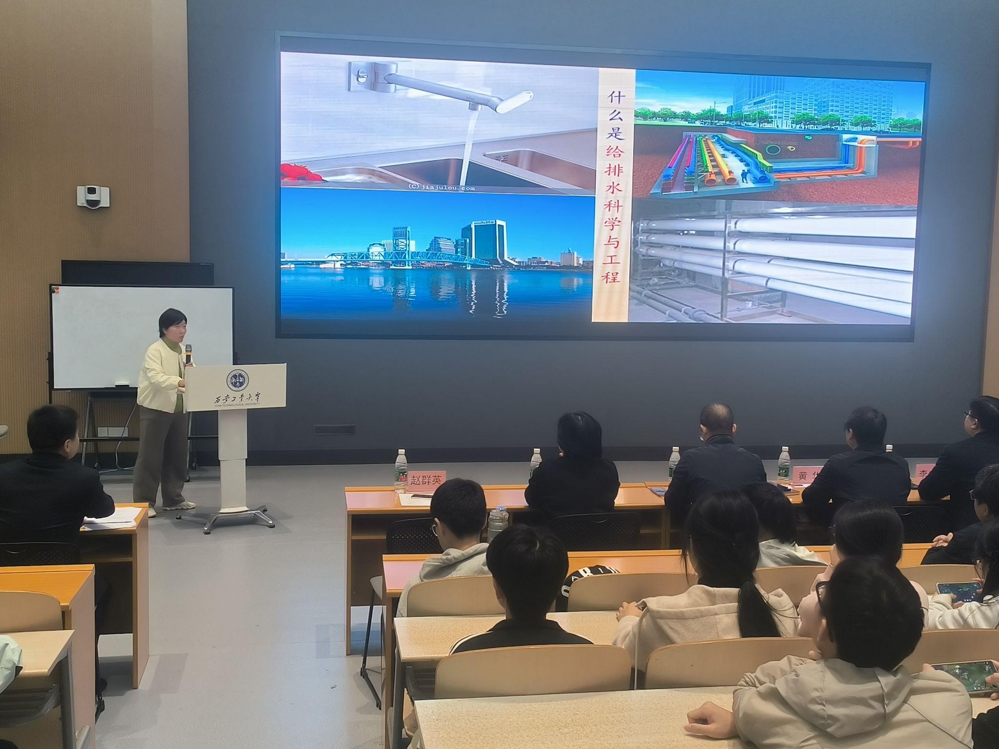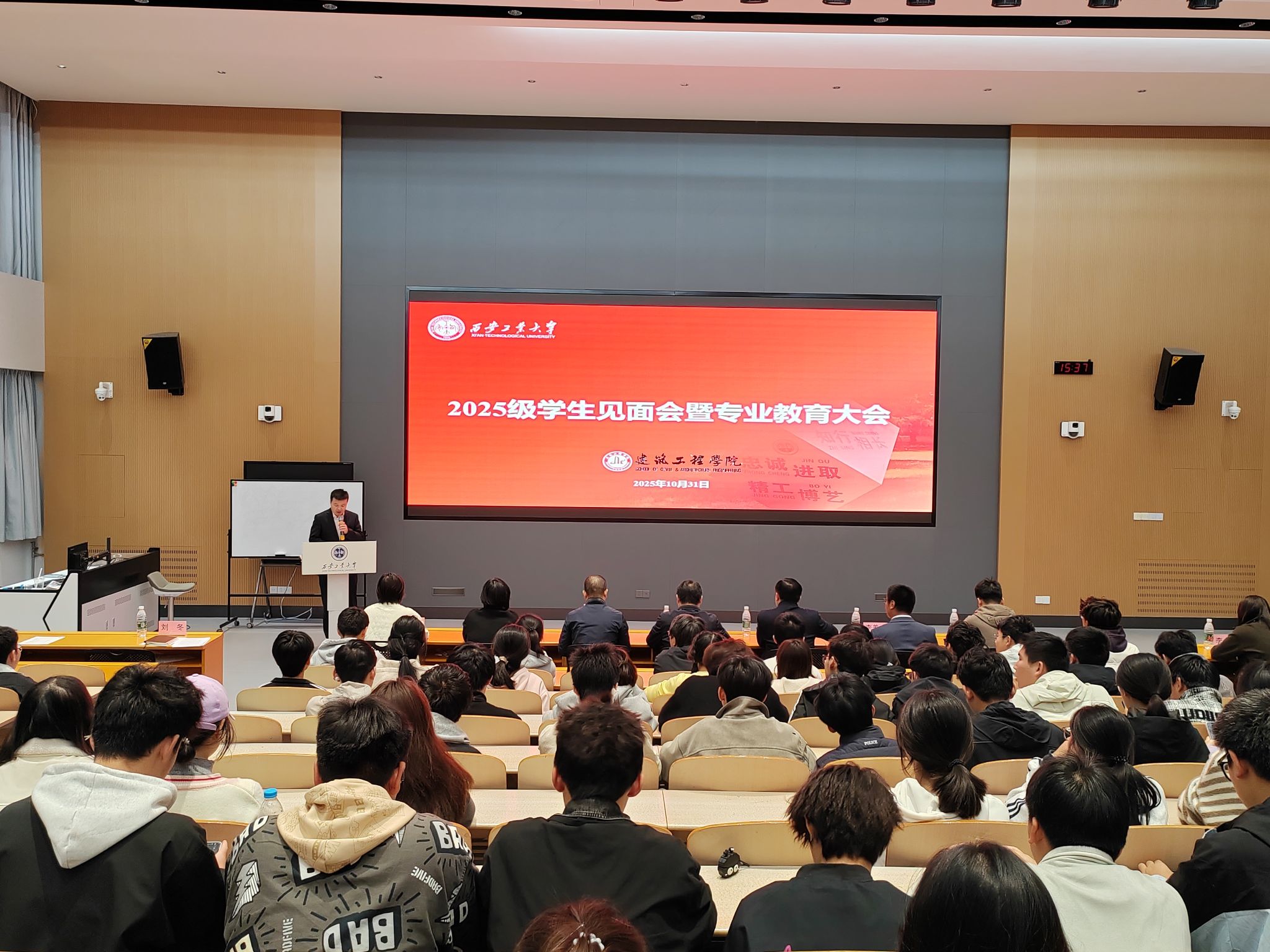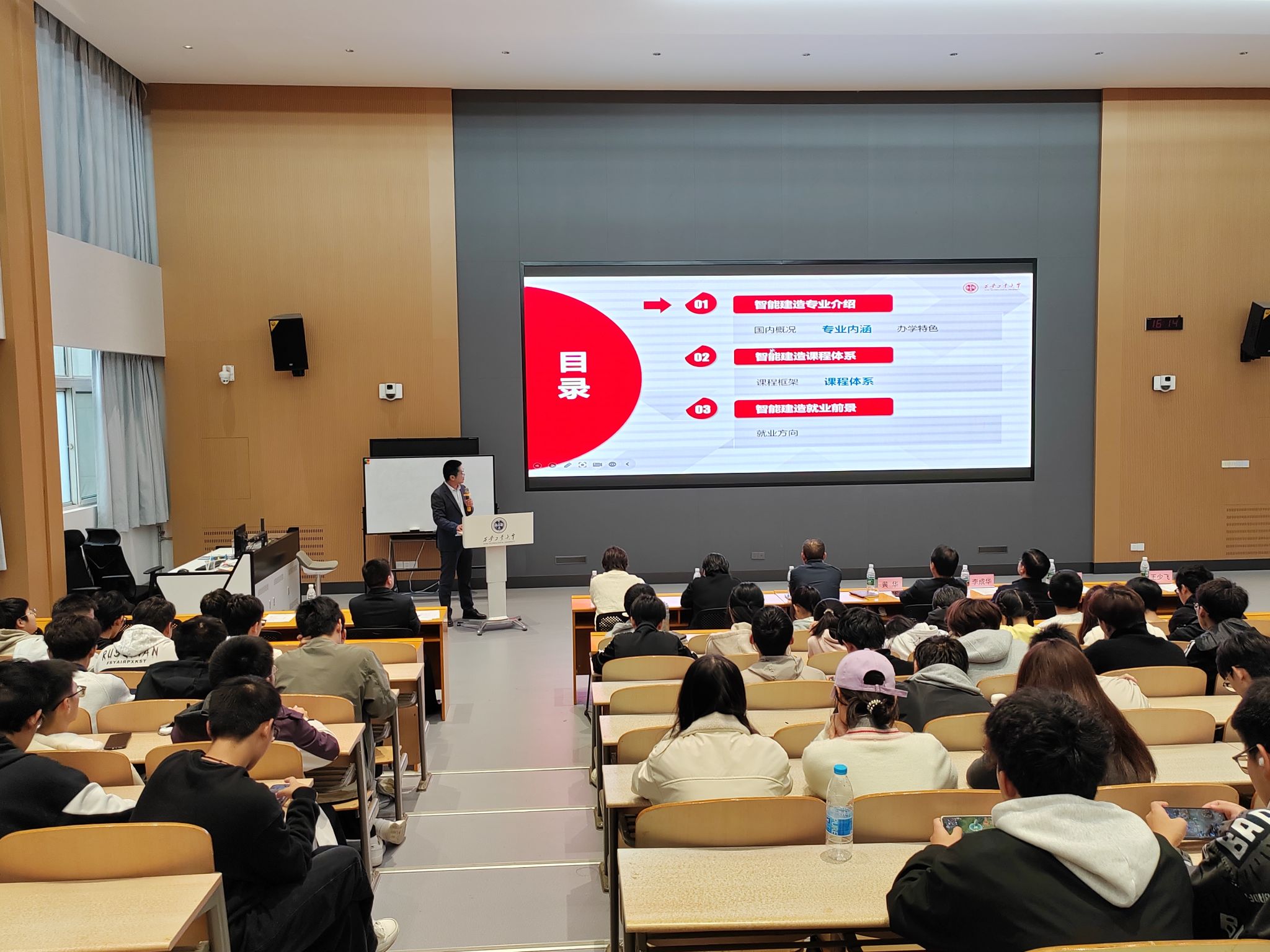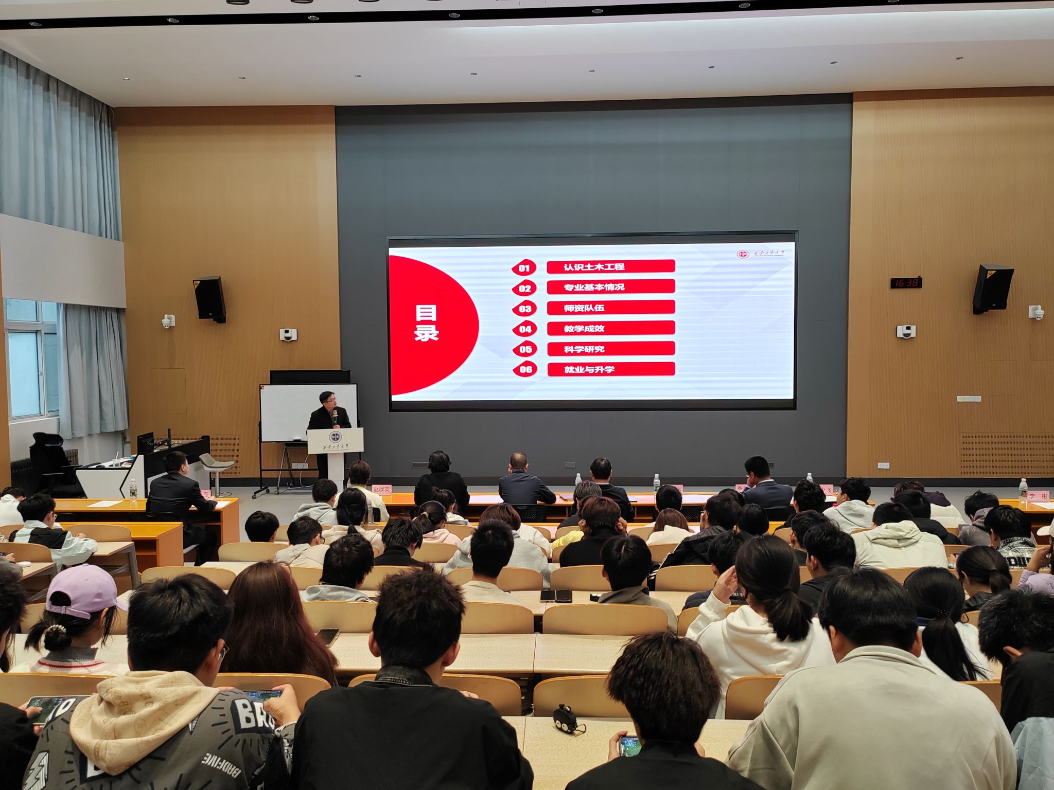会议在庄重而热烈的氛围中拉开帷幕。刘冬首先介绍了与会领导与教师代表,并对全体新生的到来表示诚挚欢迎。在专业介绍环节,各系主任依次登台,为新生带来系统而详实的专业讲解。给排水科学与工程系主任赵群英从学科概况、培养目标、课程设置、实践平台、师资力量和就业前景等方面,全面介绍了该专业的特色与发展优势,突出其在水资源保护与市政工程等领域的重要作用。智能建造系主任李养成围绕“智能+建造”融合发展的前沿理念,系统阐释了专业的核心内涵、国家战略背景、课程体系及就业方向,强调其在推动建筑业数字化转型中的关键地位。土木工程系主任李成华则系统阐述了土木工程作为国家基础设施建设支柱的重要地位,详细介绍了该专业在建筑工程、道路桥梁、地下工程等方向的培养特色、课程体系与发展前景,鼓励新生夯实专业基础,积极投身国家建设事业。