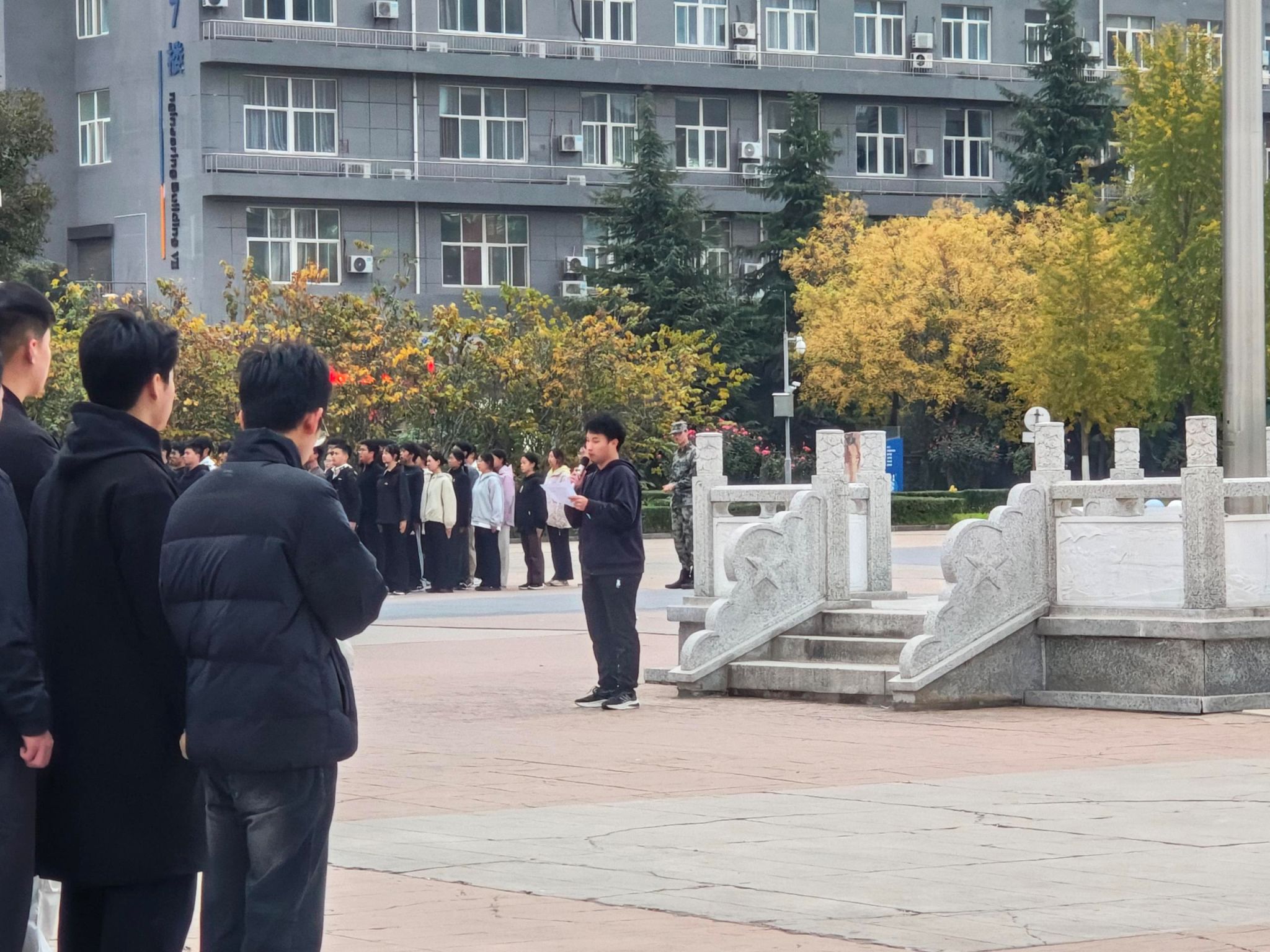 6时45分,全体学生按要求完成列队。升国旗仪式正式开始,国旗护卫队护送国旗入场,鲜艳的五星红旗冉冉升起。师生保持肃立,面向国旗行注目礼并齐唱国歌。仪式结束后,学生代表以"在国旗下担当"为主题发表演讲,激励同学们勇担时代使命,将个人成长融入国家发展。整个过程秩序井然,展现了建工学子良好的精神风貌。