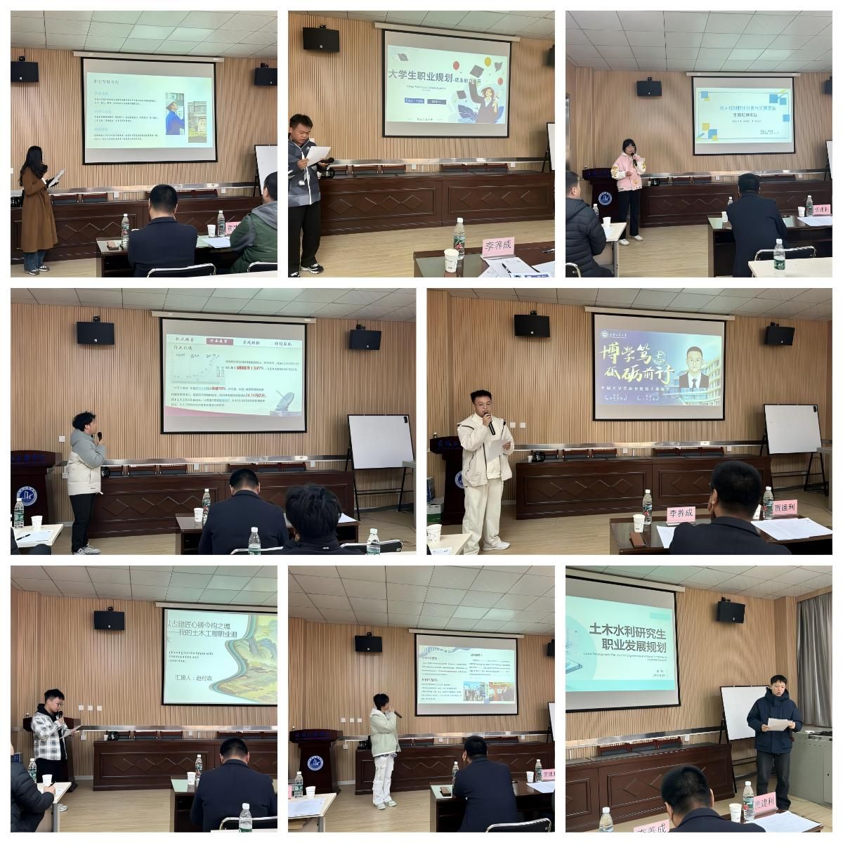 党委副书记贾建利、城乡规划专业负责人杨晓娟、智能建造系主任李养成、学工办主任刘冬、辅导员秦亚敏、翟逸玥担任评委,来自成长与就业赛道的20名选手参与现场展示。