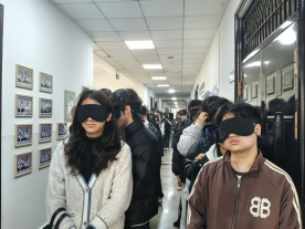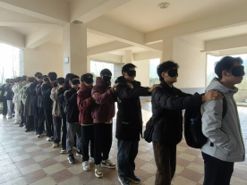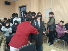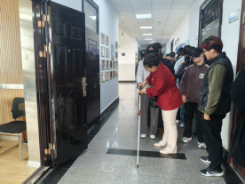在最具触动的互动体验环节,同学们戴上眼罩,沉浸式感受视障人群的日常视角。失去视觉的瞬间,行走、辨物都变得格外艰难,短暂的体验让大家直观体会到视障人群在生活中面临的重重挑战。体验结束后,同学们纷纷分享感受,从最初的不安迷茫,到对“看见”的重新定义,每一份感悟都饱含着对生命的尊重与共情,也让大家对“换位思考”有了更深刻的理解。