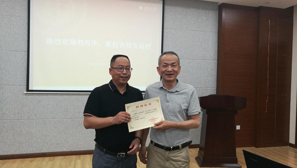 近年来的发展情况。校党委副书记吴介军代表学校为蔡松青颁发了兼职教授聘任证书。校友总会办公室主任姚颖代表学校与蔡松青校友签订了捐赠协议,并对社会奖学金设立情况进行了说明。副校长刘卜代表学校为蔡松青颁发了捐赠证书。