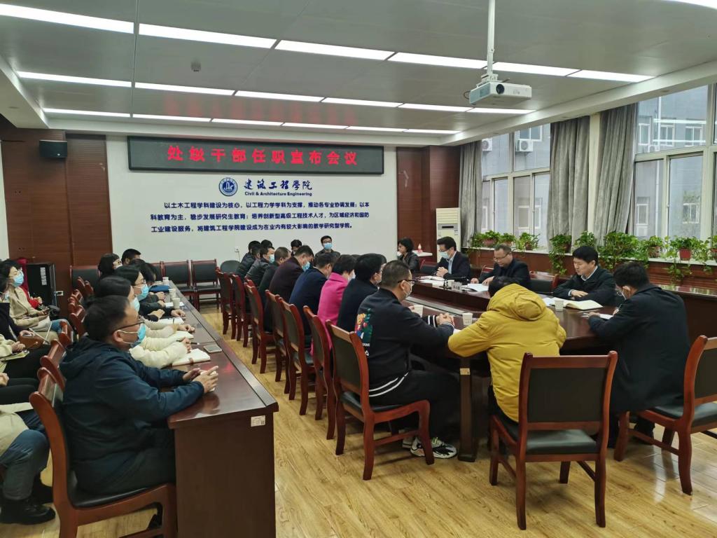处级干部任职宣布会议在工科4楼302室召开,西安工业大学党委书记刘卫国、校党委组织部常务副部长梁闪慧、校党委组织部副部长赵伟出席了会议。