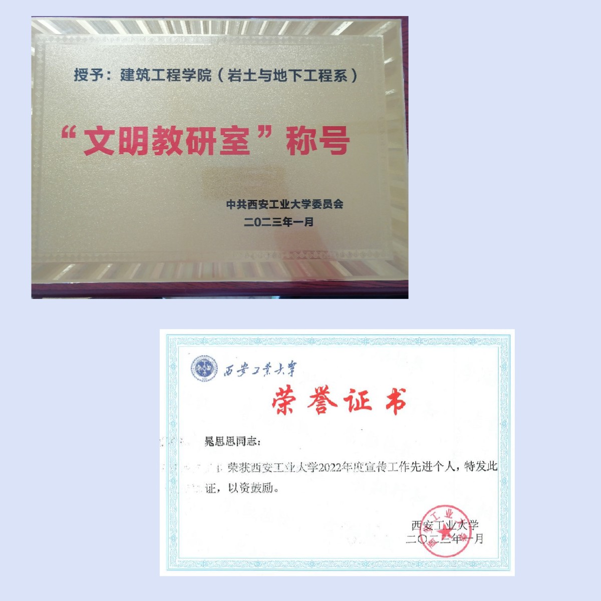 荣获2022年度“宣传工作先进集体”称号,“构建育人工程,凝聚师生发展共同体”荣获校园文化建设优秀成果一等奖,岩土与地下工程系荣获“文明教研室”称号以及晁思思荣获“宣传先进个人”。