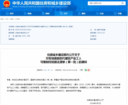 1月3日,住房城乡建设部印发培育新时代建筑产业工人可复制经验做法清单(第一批),我校比分网站