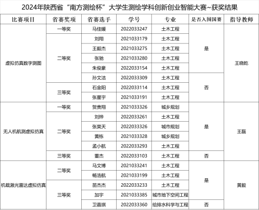 的24名选手由王晓乾、王磊、黄毅三位老师指导参赛,代表队在虚拟仿真数字测图、无人机航测虚拟仿真和机载激光雷达虚拟仿真三个赛项上成绩斐然。马佳媛和贺贵翔同学分别荣获虚拟仿真数字测图比赛和无人机航测虚拟仿真比赛的一等奖,其它同学荣获11个二等奖和6个三等奖;选手获奖比例79.2%。王晓乾和王磊老师荣获省赛优秀指导教师奖。