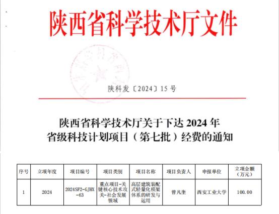 近日,陕西省科技厅公布了2024年省级科技计划项目(第七批)补助经费的通知(陕财办教)〔2024〕124号),经答辩评审以及会议研究审定等环节,全省社会发展领域共立项72项。西安工业大学建工比分网站