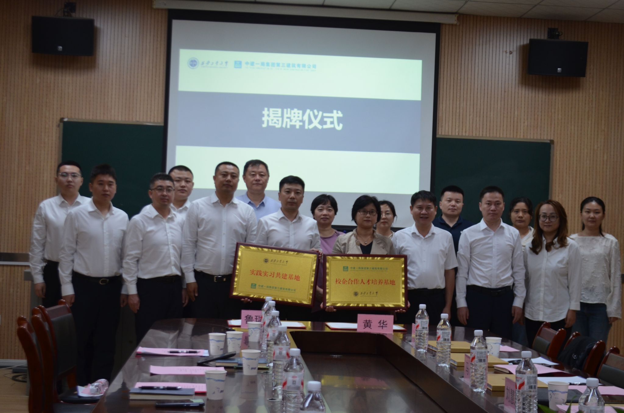 院长黄华与中建一局三公司西北分公司副书记鲁瑞军共同签署就业实习基地合作协议,并互赠校企合作牌匾。