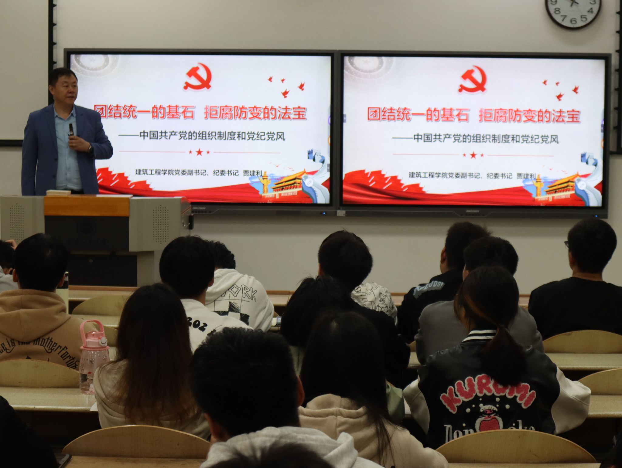 开班典礼结束后,贾建利以“团结统一的基石,拒腐防变的法宝 “为题为本期积极分子进行第一次理论授课。他着重强调中国共产党的组织制度和党纪党风使同学们明确了党的组织原则和组织机构以及党的纪律,学习了党的优良作风,并提出五点对青年大学生的期待。希望各位入党积极分子在今后的学习、工作和生活中努力做到知行合一,以党员的标准严格要求自己,不负党和人民的殷切期望。